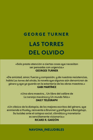 "Si George Turner lo publicó en 1987 y su propuesta continúa tan vigente, será porque se trata de un clásico. Dicen que Las torres del olvido es una novela de ciencia ficción. Algunas etiquetas la distinguen como «la primera gran novela del subgénero cambio climático». Son formas de hablar sobre una obra que anticipó con inquietante exactitud el mundo que está llamando a nuestra puerta." Gabi Martínez